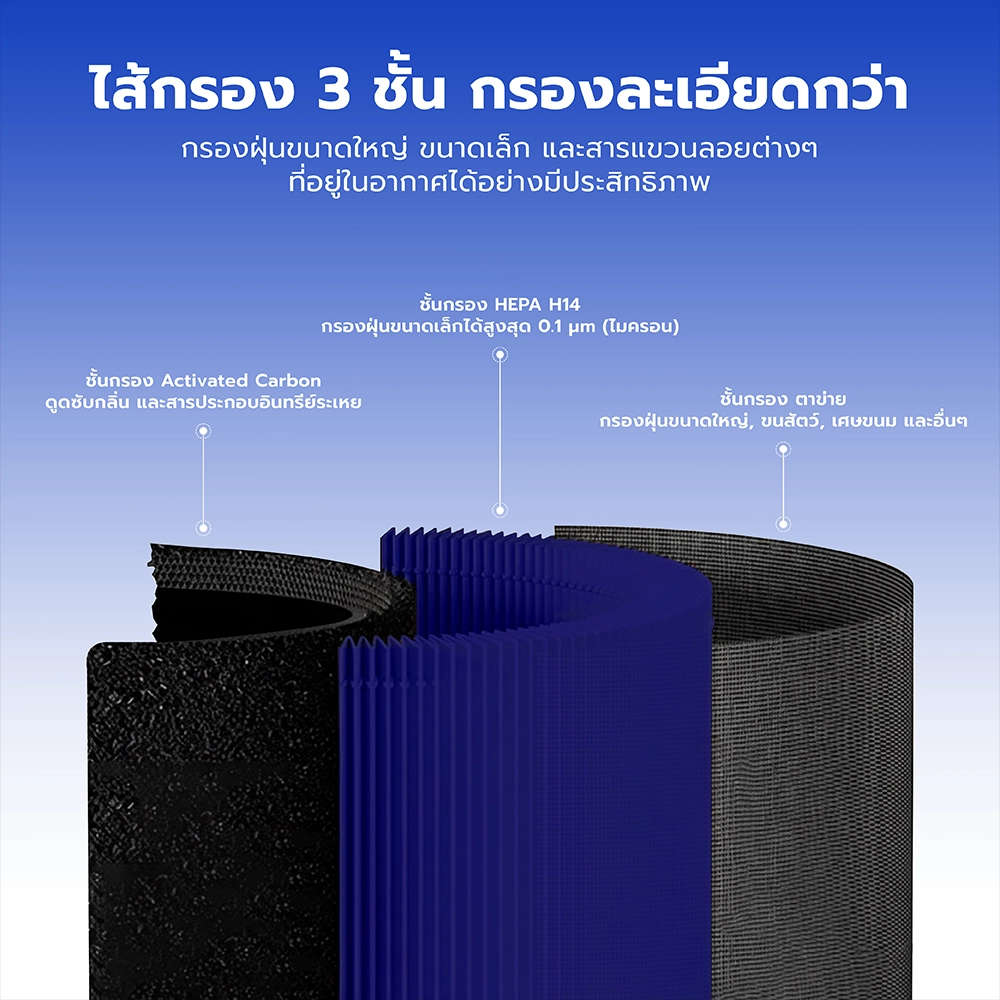 - ไส้กรอง 3 ชั้น อัปเกรดใหม่ ให้มีประสิทธิภาพการกรองฝุ่นขั้นสุด